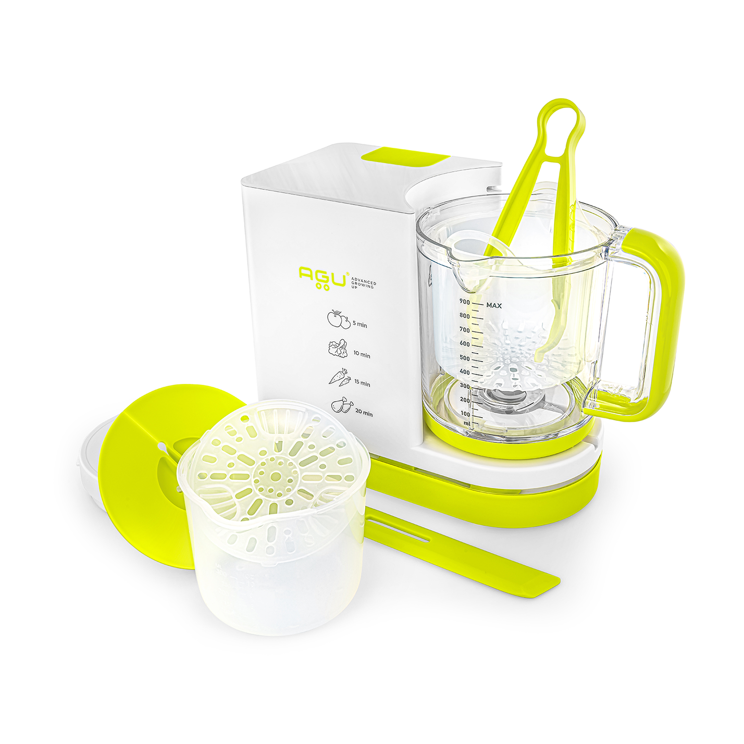 Каждый ребенок – это индивидуальность с индивидуальными вкусами, которые меняются со временем. Процессор для приготовления детских блюд AGU – прекрасный прибор для приготовления здоровой пищи, которая понравится всем. В нем сочетаются 5 функций: пароварка с двумя режимами, стерилизатор, блендер с двумя режимами, подогреватель детского питания и система поддерживания температуры.